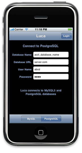9. Connecting to PostgreSQL. If you've stored your accounts in PostgreSQL, Luca for iPhone work the same for you. |