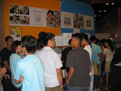 Meanwhile, at the Apple booth, they're reeling in the money. These fellas are actually queueing up to give Apple some of their hard-earned cash.