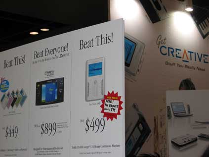 Creative unveils its not-so-clever "imitation iPod" at the Comex computer show in Singapore - even down to using Garamond on the poster, similar colours to the iPod mini, and what looks like Chicago on the music player's screen. The device will remain un-mentioned here. Embarassing doesn't even come close to describing it.
