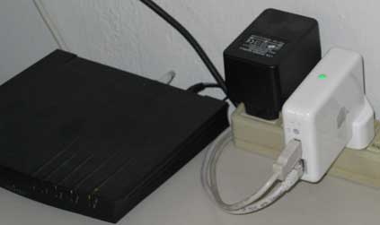 I've only used two out of the possible three connections. I don't have speakers connected at the moment, but one line goes to the broadband modem (next to the Airport Express) and the other goes to the USB-based Epson Stylus 870. But notice the size of the power plug that we use in Singapore. It'll be interesting to trace how we came to choose the three-pin type plug. Is it possible, now, to switch en-masse to the thinner two-pin plugs - because the day will come, soon, when many of the equipment we use are actually smaller than the power plug they need.