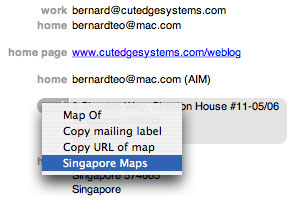 I've created an Address Book plug-in for Singapore Maps (based on Stephen Wither's WhereIs plug-in for Australian Maps). I modified Stephen's AppleScript code and made it work with Singapore's streetdirectory.com. I also wrapped a one-click installer around it. The installer looks like this and you can download it from here.