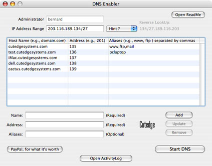 I've got a more "useful" version of DNS Enabler done. It's meant to be used by people who don't know and don't care about things like CNAMES, MX records, PTRs,and A-RECORDS. But they know enough about the domain name system to want to be able to reference machines by human-understandable names. The people who're downloading DNS Enabler now want to be able to do things like this, for a private 10.0.1 network :