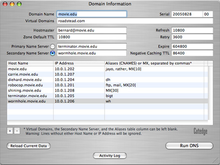 Everything works exactly the same as before except that the radio button allows you to indicate that this is going to be a back-up (slave) name server that reads its zone data from a primary (master) name server. Hit the Run DNS button and this slave will keep itself synchronised with the master, updating its zone data files whenever the master changes. Neat. If your primary name server goes down, there's still this backup. Except that the slave saves the zone data in the "shortened" $ORIGIN format, below, and I've been using the "long" (probably archaic) format up to now.