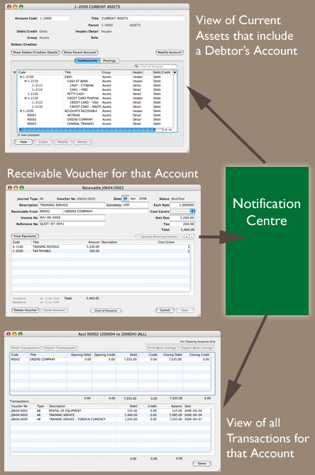 In the Accounting System, you may be looking at your Current Assets, which includes a Debtors' list. Then, from another window, you may be creating a Receivable Voucher for a particular debtor. If you happen to be also monitoring that debtor's list of transactions, its totals will be updated as soon as the data entry for that voucher gets completed. If you're looking at the totality of all your transactions under Revenue, that figure will also get updated. Switching back to the point of view a programmer, it's very hard to do this type of coding on your own - unless you hit upon the idea of having a Notification Centre to centralise, coalesce and dispatch all the notifications in an orderly way, which I thought was brilliant when I came across it because I had been doing this type of programming on my own and they were often a mess. And look at the economics of the situation. It's a nice-to-have feature. So the amount of time you spend programming it should be kept in proper relation to the amount of code that really does the dog's work in the application. In other words it shouldn't be carrying too much weight, otherwise it would be like the tail wagging the dog. But what it gives your application, if you get it right, is a feeling of omniscience, and you know how God-like that feels. So that's what the Notification Centre, and lots of nice touches in the rest of Cocoa, does - it tips the economics in the favour of the creative programmer, by making it possible to do this in the time you are allowed to allocate to it. So, if you're a business owner and you hear your IT manager saying that he won't accept a language like Objective-C or a tool-set like Cocoa - "who has heard of it" and he can "pick up a Java or Visual-Basic programmer from any street corner" - rest assured that that street-corner programmer hasn't spent any time thinking through the economics of programming or scoured the world for the best programming tools to build the best business applications on. That's the fight we are in. If we had stayed in organisations we'll never have been allowed to do this. There is a world of Mac users out there. There's no time to spend debating the issue. There's work to be done and let's just do it.