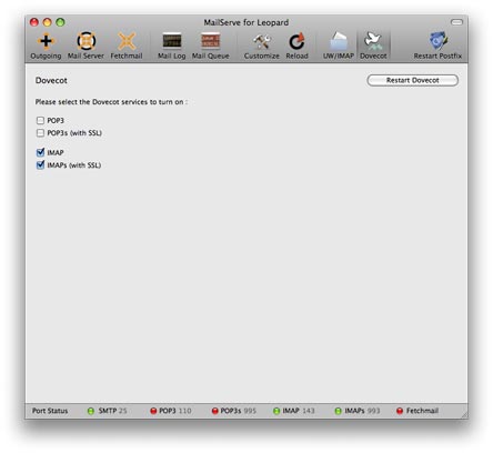 But if anyone would like to try it, just write to me. I don't yet have a download link because I need to make it work on PPC machines, too, and I'd like to offer this trial version first to MailServe for Leopard users. I haven't thought about how I'm going to sell it. Probably it'll be a paid upgrade to MailServe for Leopard users. But I've got some way to go yet in terms of putting in the features. For example, I'm going to start on an LDAP Enabler. And when that gets done, the interaction between the mail server and the LDAP server starts to get interesting, by way of Dovecot. So I hope to get LDAP Enabler done soon and then we'll see how it goes.