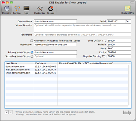 I've been working on DNS Enabler for Snow Leopard. I've released DNS Enabler 4.0.3, a day after releasing 4.0.2, because while working on adding CIDR-formatted IP address support to 4.0.2, I've realised that people do use DNS Enabler to manage a whole lot of domains. So, that one line data entry field for Virtual Domains is getting to be vastly inadequate. (And that goes the same for MailServe). I've extended the length of that field, for the moment, while I take some think about how I should be handling this going forward :