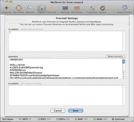 MailServe Snow uses Procmail to integrate Postfix, Dovecot and SpamBayes to implement spam filtering. With version 4.1.4, the user can now set up custom Procmail directives to be processed before or after the default procmail directives for handling spam filering.
