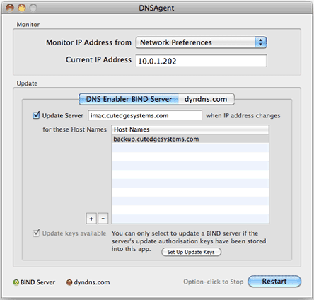 Setting it up to use with dyndns.com is dead easy - just enter your members.dyndns.com userID and password by clicking on "Set Up Update Keys" button, enter the host name(s) of the machine for which you want DNS Agent to update dyndns.com, start the IP-address monitoring daemon, and you're good to go (as shown above). You can then close the app because the daemon continues to run, even across reboots, until you stop it. Setting DNS Agent to work with a DNS Enabler Snow DNS Server is just as easy. I'll come to it next when I've finished updating DNS Enabler Snow's web page. But DNS Agent is available now. Only for Snow Leopard.