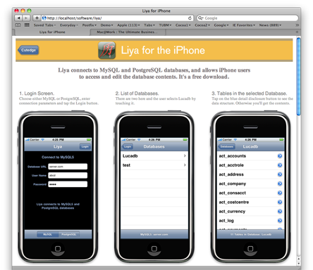 I've submitted this app to the App Store - it's Liya for the iPhone. Liya connects to MySQL and PostgreSQL databases, and allows iPhone users to access and edit the database contents. It'll be a free download.