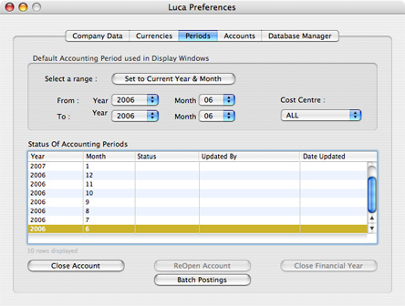 I've updated Luca to work with the OS X 10.4.9 that was just released today. But, more importantly, this 2.5.4 release of Luca contains a new "Batch Postings" button (see below). One of the problems with transitioning Luca to a "shrink wrapped application", when it used to be a custom-built application that I embed into enterprise systems in my previous life as a custom software vendor, is that I won't be anywhere physically near the system when anything goes wrong with it. And one of the things that could go wrong is that the accounts stop balancing - due to a program bug or a loop-hole in the assumptions we used to model the business rules. Now, in a custom built application, I would usually be able to go over to the customer's site to trouble-shoot and patch the data to make the accounts balance again. But it would be difficult to do this once we scale this to support hundreds or thousands of users all over the world.