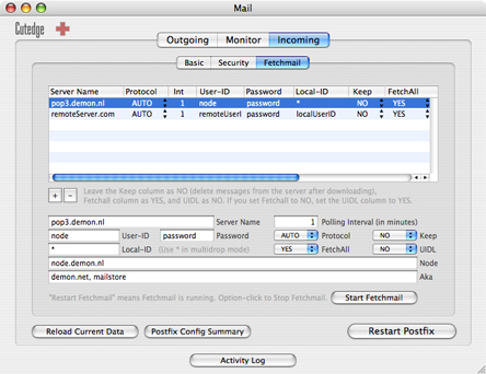 For example, you may have all of your mail delivered to a single mailbox on pop3.demon.nl, under an account named node.demon.nl. This account receives mail for annie@node.demon.nl, jack@node.demon.nl, etc. What you want Fetchmail to do is to log into your node.demon.nl account with your user name, node, and give your password, and get Fetchmail to download and split the mail into individual mailboxes - for annie, jack, etc - on your server machine. Then these individual users will log onto your server, and read their mail via IMAP or POP, just as if their mail had been sent there all along. Fetchmail does the job of splitting the mail into the individual mailboxes and the individual users can forget about the existence of the pop3.demon.nl server. This way, you can consolidate the mail for all your users, from any number of ISP POP servers, into their POP or IMAP accounts on your own mail server. MailServe, with this improved Fetchmail integration, will now allow people to do all that. I've just got to test it a little more and release it tomorrow.