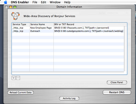 This is experimental. It's an extension to DNS Enabler that will allow the user to configure the DNS server so that it'll also broadcast Bonjour services (that the user has happened to have set up) so that they can be discovered, browsed, and accessed from the wide-area network (rather than on just the local network). I may also add a couple more new features to the next DNS Enabler release that people have asked for (e.g., the ability to set the DNS server so that it doesn't do recursive lookups, and the ability to restrict the range of IP addresses that you allow lookups to be made from). So, lots of things to do.