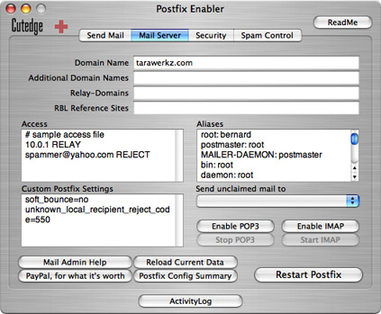 Thanks for sharing the solution, Ronnie. For point 4, the line to add in the /etc/postfix/master.cf file is : 587 inet n - n - - smtpd There is already a line that says : smtp inet n - n - - smtpd so you add the 587 line to it. I'm thinking of making this even easier to do by incorporating it into the Postfix Enabler interface - probably the version that I'm preparing for Tiger. But, for the moment, this looks easy enough to do, manually. So, there. I ought to look into all my mail about Postfix Enabler and do an FAQ. Oughta. Shoulda. Gotta find the time.