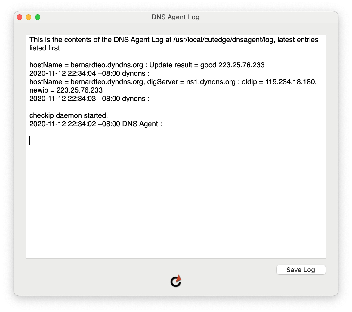 The DNS Agent Log can be accessed via the Help menu. It will record the times when DNS Agent detected that the IP address has changed and whether it was successful in updating the DNS Server.