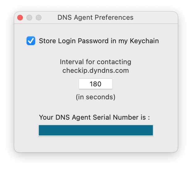 The image below shows DNS Agent monitoring the IP address using the other option (checkip.dyndns.com), instead of Network Preferences. When the machine that DNS Agent is monitoring is behind a router, its external public IP address is the more important address that other machines on the Internet will use to find your machine.