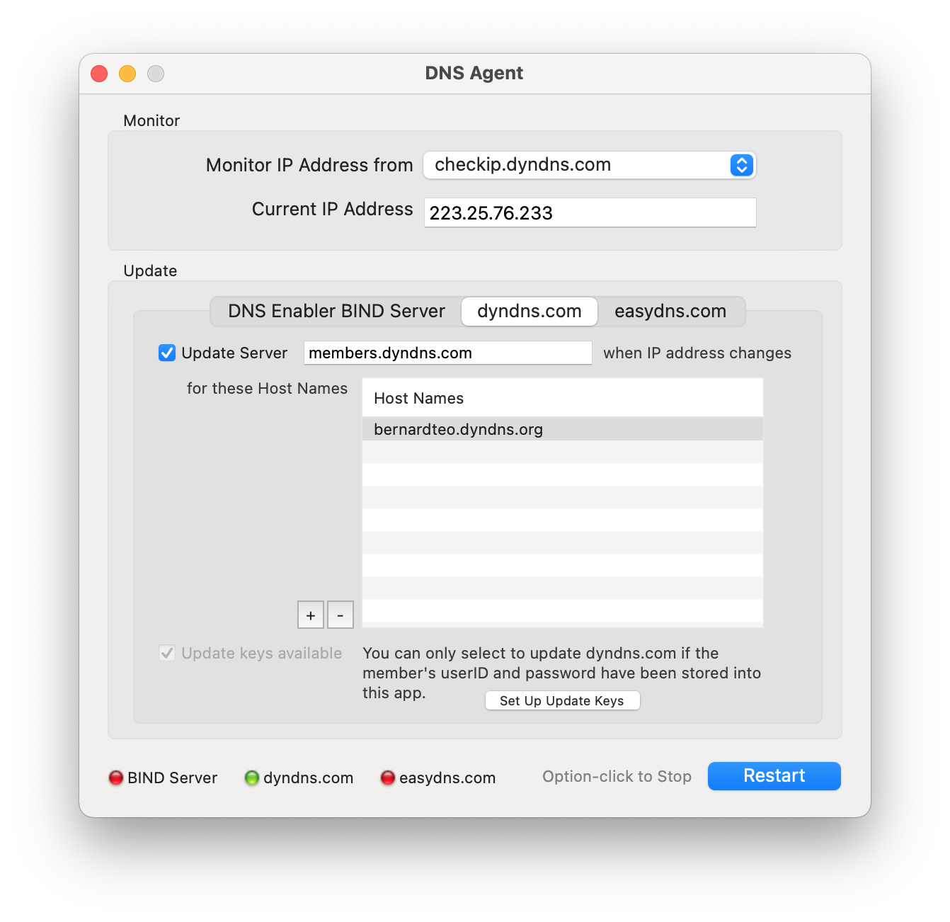 Click the Start button to launch DNS Agent's monitoring agent. Whenever the machine's public IP address changes, dyndns.com's DNS Server will be updated.