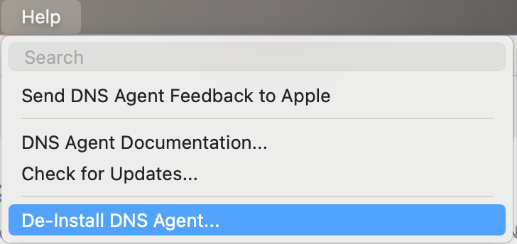 You can de-install DNS Agent by using the last menu item in the Help menu. It will shut down the DNS Agent daemon, if it is running, and remove all files installed by DNS Agent (in /usr/local/cutedge/dnsagent).