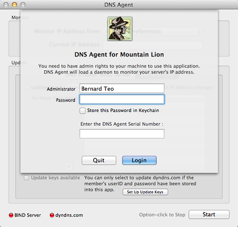 Note : The DNS Server must be running either DNS Enabler for Lion, Mountain Lion, or the Snow Leopard version, in order to have the dynamic DNS update capability. DNS Enabler can be made to generate an Authorisation Key for DNS Agent to use so that it can identify itself to the server as a valid client.