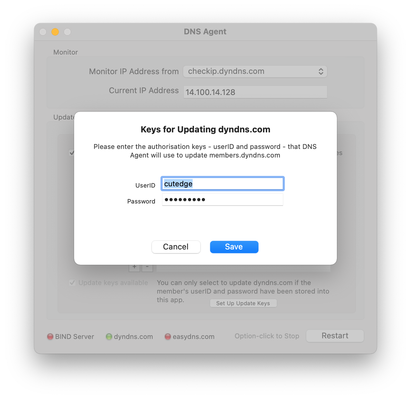 Clicking on the "Set Up Update Keys" button on the dyndns.com tab panel will open the following dialog for you to enter a dyndns.com member ID and password: