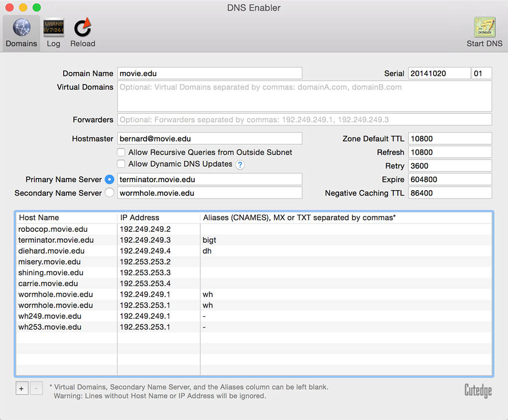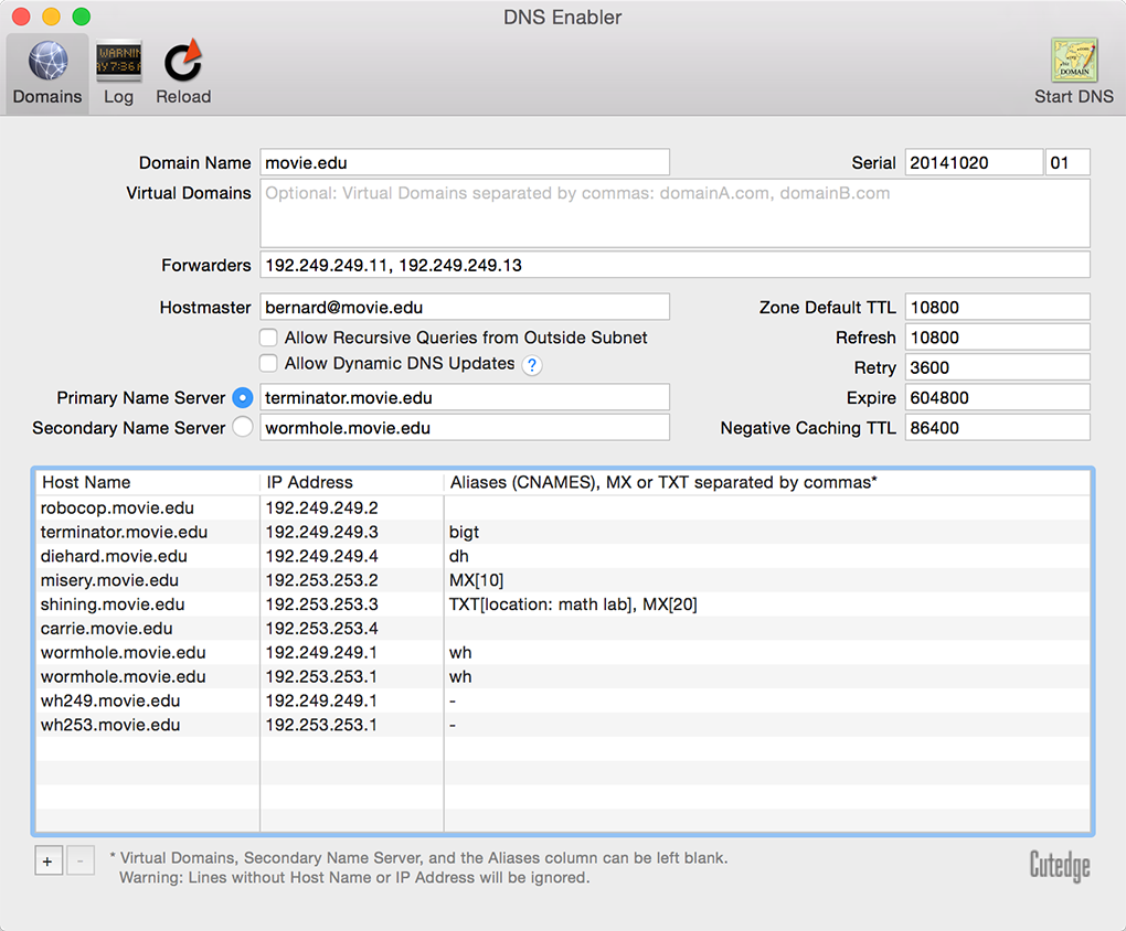 Two other computers have aliases - terminator.movie.edu, which is known as bigt.movie.edu, and diehard.movie.edu, also known as dh.movie.edu. In the example above, DNS Enabler should be installed on the machine named terminator.movie.edu, which is the primary name server for the domain movie.edu. When you hit the Start DNS button, DNS Enabler will read in the name-address mappings, start up name services so that other computers can get answers to these name-address queries (and keep these running across reboots). DNS Zone Files This is the zone file created by DNS Enabler for the above configuration: DNS Enabler will also create the reverse pointer records. What about MX Records, TXT Records, and Forwarders? The following picture shows how you would handle MX and TXT records and Forwarders for the domain movie.edu :