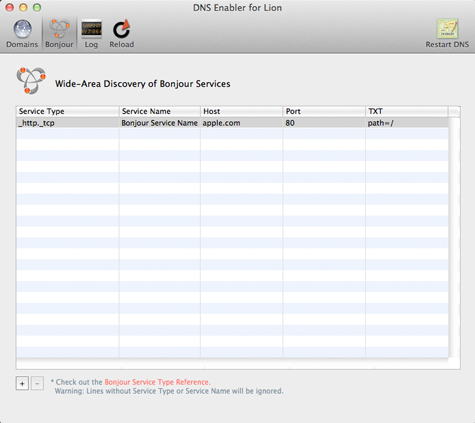Drag the Authorisation Key, as represented by the icon on the bottom-right hand corner of the dialog box, to the machine running DNS Agent, whose IP address is being tracked. You can drag the key file to the server's desktop and transfer it to the client machine via file-sharing or via email. Once on the client machine, if you have the DNS Agent application there, you can simply double-click on the key and it will open the DNS Agent app. Save the key and follow the instructions on the DNS Agent web page. In a couple more steps (which involves entering values for the address of the DNS Server and the host name you are updating for), you are done, and you can quit the DNS Agent, which leaves a daemon running, even across shut-downs and reboots, that will always update the DNS Server with that client's current IP address. Bonjour Wide-Area Services The Bonjour panel allows DNS Enabler to be used as a configurator for Bonjour services, to enable wide-area discovery of Bonjour devices :