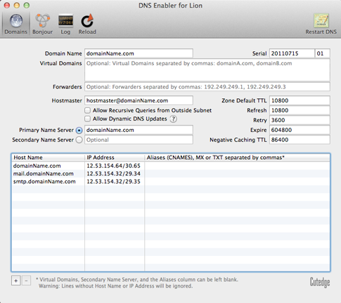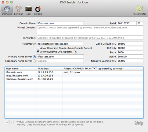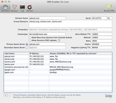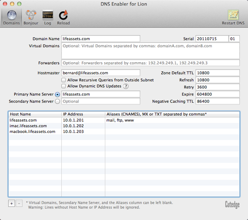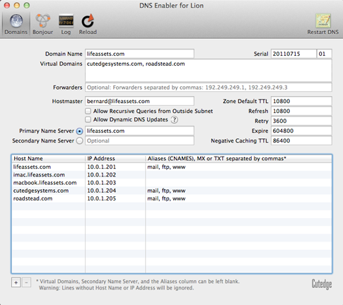 Let's say that the local network is on subnet 10.0.1.x and you've decided to have a web server, a mail server, and an ftp server on a static IP address 10.0.1.201, plus other servers on 10.0.1.202 and 203. To simulate real world conditions and not have to change your code when you move to a production environment, you want to access the servers via domain names, e.g., lifeassets.com, as shown above. So this is what you do. You run DNS Enabler on the 10.0.1.201 machine and set it up as shown. You can now point all the other machines on the local network to use 10.0.1.201 as their name server (via the DNS Server setting in their Network Preferences). This way, all the local machines can now access the mail, web, and ftp servers via their domain names. If you've also set up an alias like www for the main server at 10.0.1.201, you can also hit that server by typing something like www.lifeassets.com into a web browser. This is a simple thing to do and it takes only a couple of minutes to set up, but it can be made even more useful. For example, you may have a few other machines containing projects at various stages of development. You can switch your machines around and test each machine in turn as www.lifeassets.com, say, just by changing the name-address assignments in DNS Enabler. Or, since this is a private local network, you can simulate more than one domain, e.g., to test the effect of sending mail from one server to another, say, from roadstead.com to cutedgesystems.com. You can set up DNS Enabler as shown here: