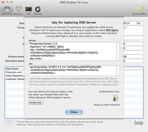 A dynamic DNS client, whose host name-to-IP address mapping is tracked by the DNS Server above, needs to run a special piece of software that will monitor the state of its IP address for changes. This service is provided by a companion application to DNS Enabler called DNS Agent (in Lion and Snow Leopard versions). Whenever the IP address changes, DNS Agent will call home to the DNS Server to update it with the latest value. In order to establish that it has the necessary authorisation to update the DNS Server, the DNS Agent needs to have an authorisation key installed that it has obtained from the server. Transferring the Authorisation Key to DNS Agent is very simple. Click on the question mark icon next to the "Allow Dynamic DNS Updates" check-box. It'll open up the dialog box, below, which provides more details about the way dynamic DNS updates work, as implemented by DNS Enabler :