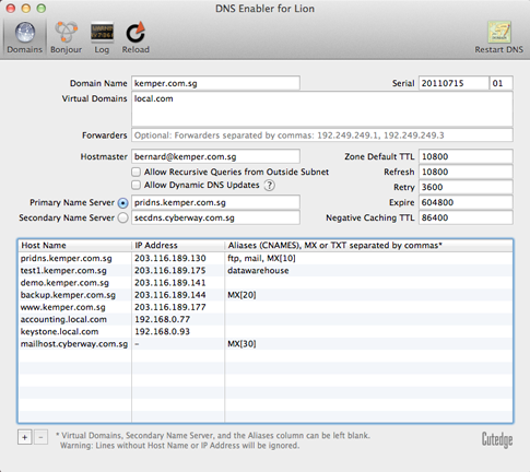 Across the firewall from the public network, the company runs a private local network (in the 192.168.0.x range). DNS Enabler can handle the setup of the name service for this local network within the same window. Because it is a private network, it can be given any domain name, which we enter into the Virtual Domains field. In our case, we use local.com, and we have two servers, accounting.local.com and keystone.local.com, that are used (and seen) only by the local users. MX records : If our ISP provides us with a backup mail server in case our whole domain is down, we can specify this backup mail server, as in the example above (with its IP number denoted by a dash - since we probably wouldn't know its physical address) : This is how our MX records will be ordered : kemper.com.sg IN MX 10 pridns.kemper.com.sg. kemper.com.sg IN MX 20 backup.kemper.com.sg. kemper.com.sg IN MX 30 mailHost.cyberway.com.sg. The following screenshot shows DNS Enabler handling the data entry for the domain described in Paul Albitz and Cricket Liu's DNS and BIND book. It shows computers on two networks, 192.249.249.x and 192.253.253.x, for the domain movie.edu, with the router between the two networks at 192.249.249.1 and 192.253.253.1. The router is given the name wormhole.movie.edu, alias wh.movie.edu and serves as a backup for the primary name server terminator.movie.edu while providing the name service for the 192.253.253.x network. [Download the configuration, here, and open it in DNS Enabler].