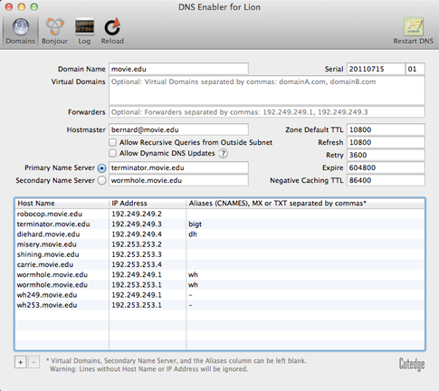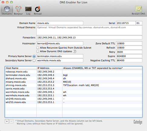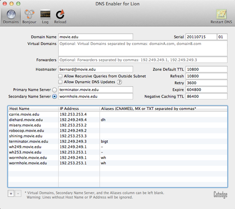 Two other computers have aliases - terminator.movie.edu, which is known as bigt.movie.edu, and diehard.movie.edu, also known as dh.movie.edu. In the example above, DNS Enabler should be installed on the machine named terminator.movie.edu, which is the primary name server for the domain movie.edu. When you hit the Start DNS button, DNS Enabler will read in the name-address mappings, start up name services so that other computers can get answers to these name-address queries (and keep these running across reboots). DNS Zone Files This is the zone file created by DNS Enabler for the above configuration: DNS Enabler will also create the reverse pointer records. What about MX Records, TXT Records, and Forwarders? The following picture shows how you would handle MX and TXT records and Forwarders for the domain movie.edu :