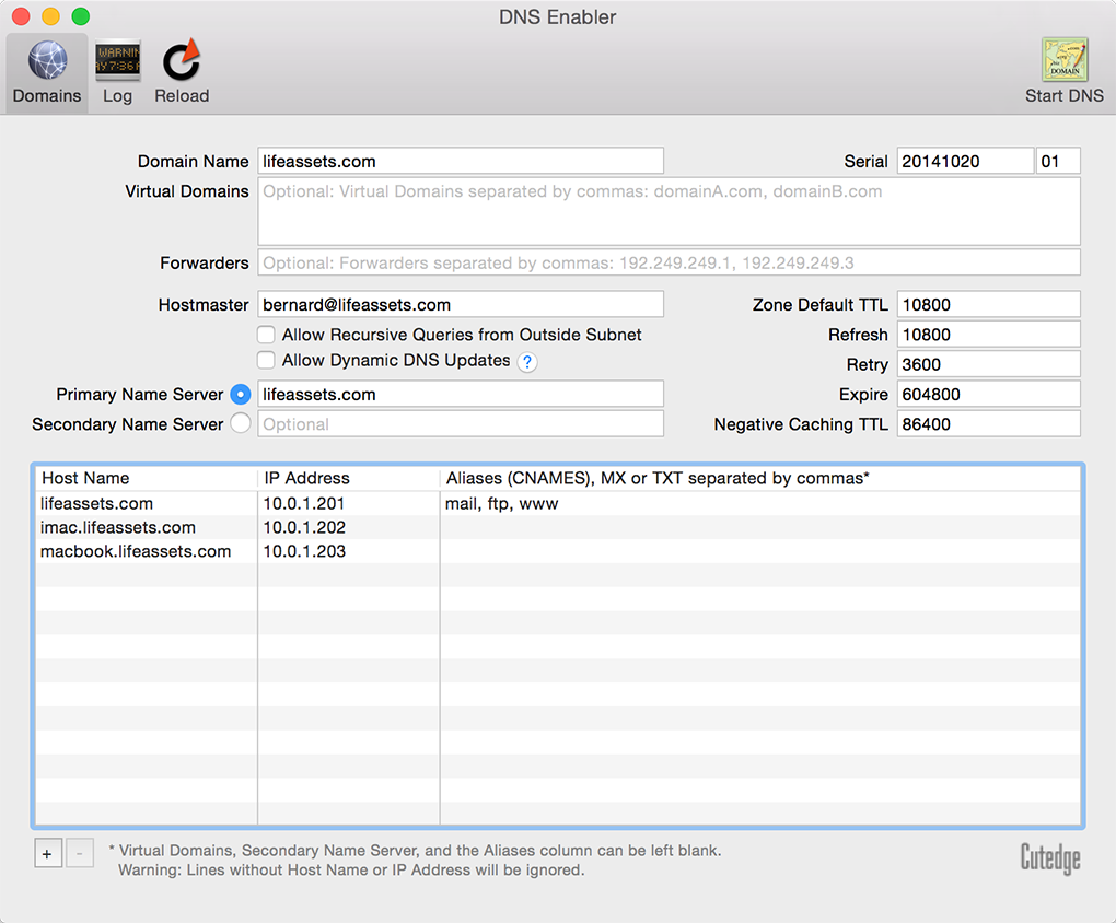 Let's say that the local network is on subnet 10.0.1.x and you've decided to have a web server, a mail server, and an ftp server on a static IP address 10.0.1.201, plus other servers on 10.0.1.202 and 203. To simulate real world conditions and not have to change your code when you move to a production environment, you want to access the servers via domain names, e.g., lifeassets.com, as shown above. So this is what you do. You run DNS Enabler on the 10.0.1.201 machine and set it up as shown. You can now point all the other machines on the local network to use 10.0.1.201 as their name server (via the DNS Server setting in their Network Preferences). This way, all the local machines can now access the mail, web, and ftp servers via their domain names. If you've also set up an alias like www for the main server at 10.0.1.201, you can also hit that server by typing something like www.lifeassets.com into a web browser. This is a simple thing to do and it takes only a couple of minutes to set up, but it can be made even more useful. For example, you may have a few other machines containing projects at various stages of development. You can switch your machines around and test each machine in turn as www.lifeassets.com, say, just by changing the name-address assignments in DNS Enabler. Or, since this is a private local network, you can simulate more than one domain, e.g., to test the effect of sending mail from one server to another, say, from roadstead.com to cutedgesystems.com. You can set up DNS Enabler as shown here: