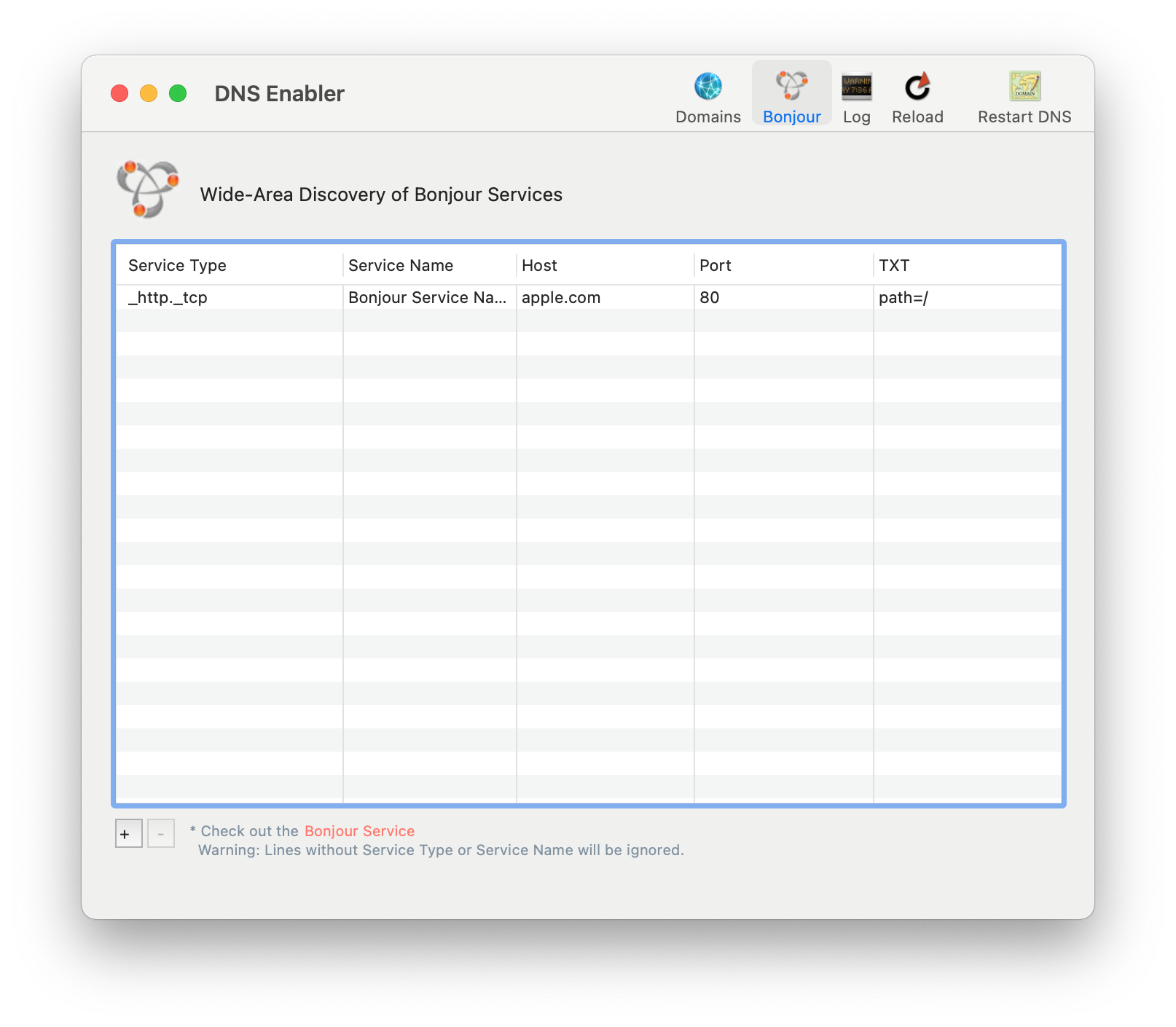 The Bonjour panel allows DNS Enabler to be used as a configurator for Bonjour services, to enable wide-area discovery of Bonjour devices :