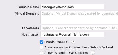 15.1 January 31st 2022. Added support for DNSSEC. Choose the Option and Restart DNS. Click the ? button to get a dialog box showing the Keytag, Algorithm, Digest Type and Digest information you need to send to your upstream doman name provider to implement DNSSEC.