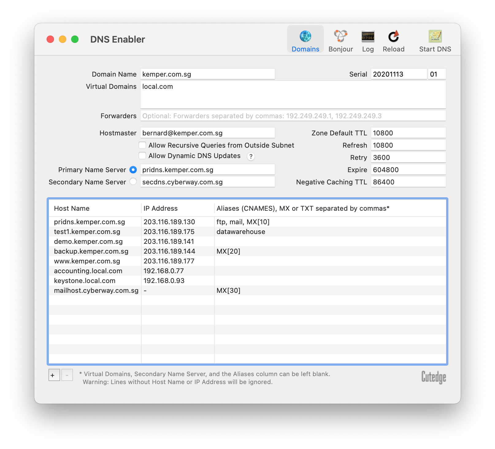 Or, since this is a private local network, you can simulate more than one domain, e.g., to test the effect of sending mail from one server to another, say, from roadstead.com to cutedgesystems.com. You can set up DNS Enabler as shown here: