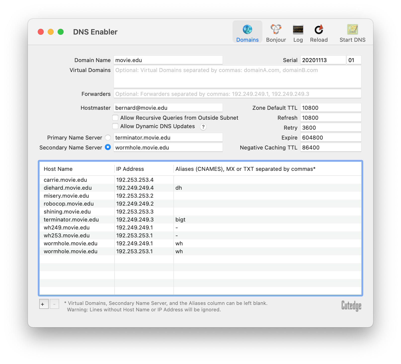 wh249.movie.edu and wh253.movie.edu are private interface-specific names used by the administrators and the dashes in the Alias column signals to DNS Enabler not to create reverse pointer records for them in the zone file.