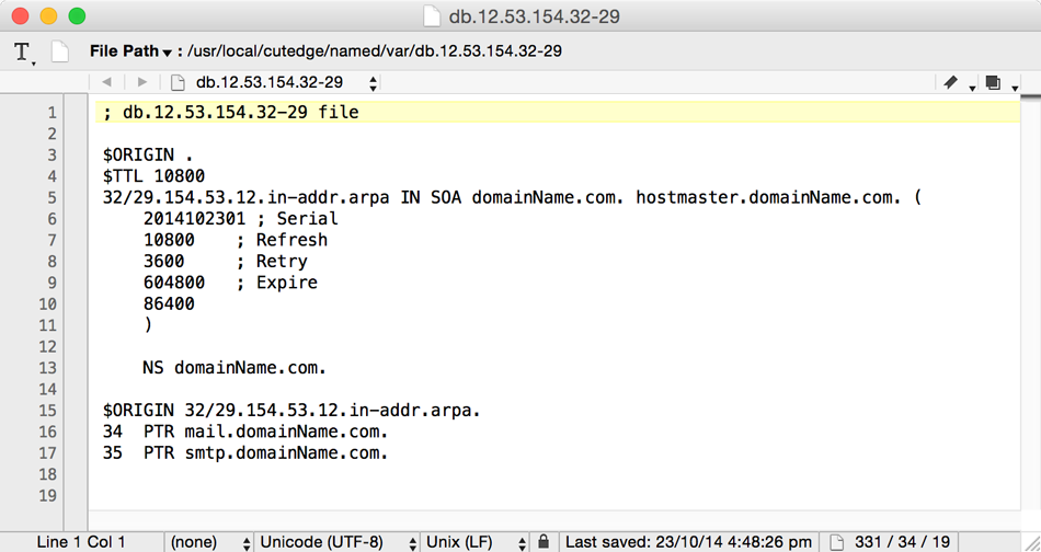 The configuration, above, can be downloaded from here. The zone file that DNS Enabler produces from that configuration is shown below :