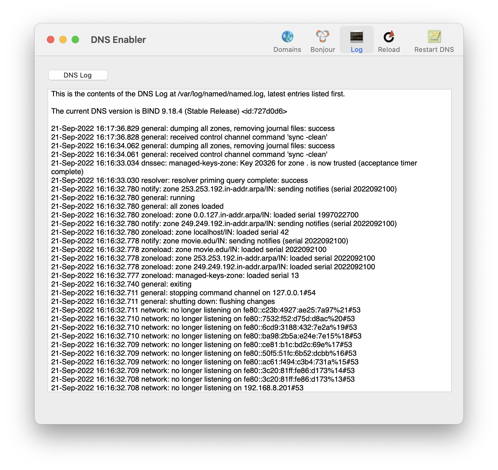 When you hit the Start/Restart DNS button, wormhole.movie.edu will now run in slave mode. It will monitor the zone files for updates coming in from the primary server. So when you make a change to the primary server (terminator.movie.edu in our example), you will see the change show up automatically on the screen of the machine running the secondary server.