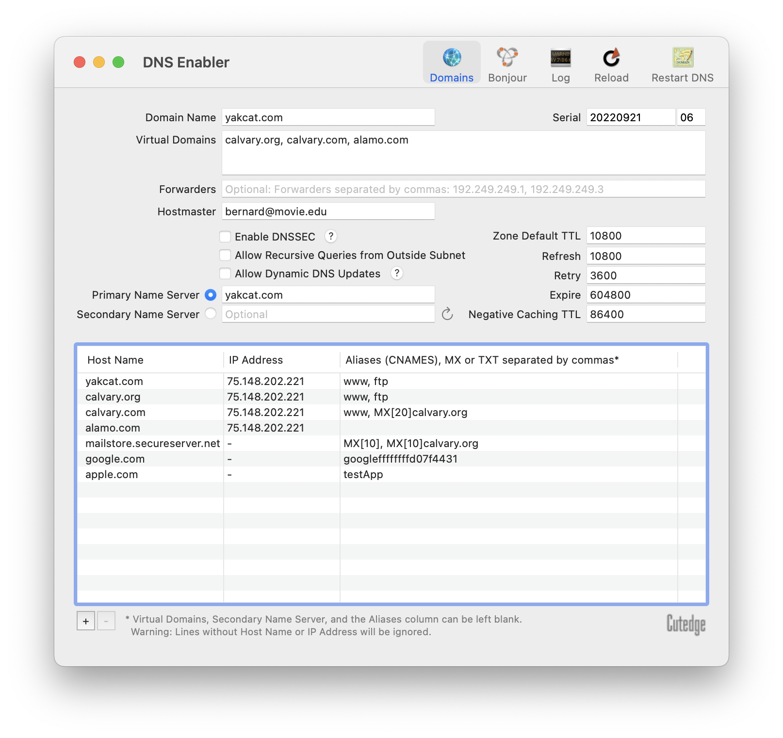 Or, since this is a private local network, you can simulate more than one domain, e.g., to test the effect of sending mail from one server to another, say, from roadstead.com to cutedgesystems.com. You can set up DNS Enabler as shown here:
