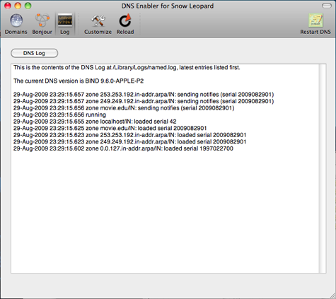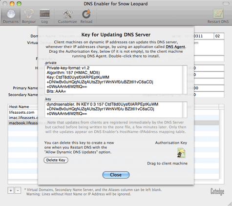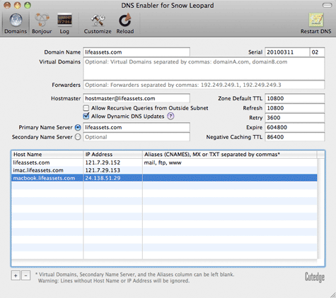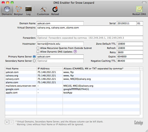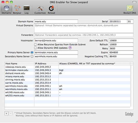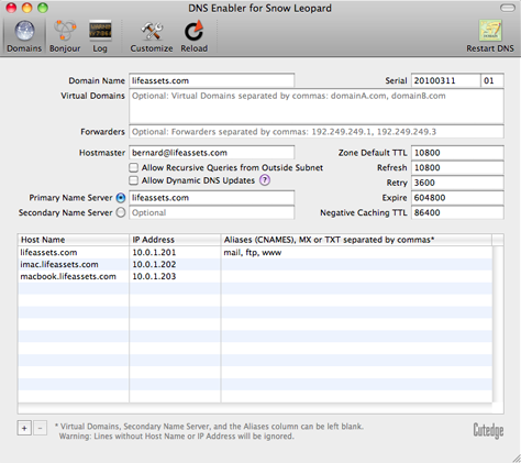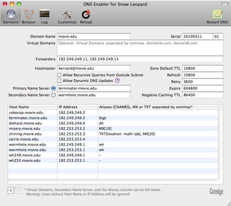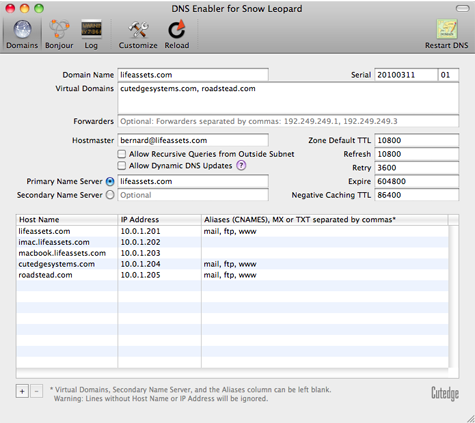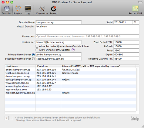 | Introduction DNS Enabler allows Mac users to set up a fully-functional Domain Name Server on a plain Mac OS X machine with just one click. It is designed to allow a user to set up domain name information quickly using a single window, in the fastest time. DNS Enabler provides the interface to allow users to specify name-to-address mappings for machines on the Internet, as well as their aliases or MX records (which specify that certain machines act as mail servers for the domain). Additionally, it allows users to set the other domain and zone information, like the Time-To-Live intervals that determine how long these information remain valid. It will automatically generate the appropriate named.conf file, the forward mapping files for each domain, the reverse mapping files for each network, and all the resource and reverse pointer records from the specifications entered. A Basic DNS Configuration for the Local Network DNS Enabler on a private local network You've set up a local network behind a router or an Airport Base Station for testing or for doing web development.  Let's say that the local network is on subnet 10.0.1.x and you've decided to have a web server, a mail server, and an ftp server on a static IP address 10.0.1.201, plus other servers on 10.0.1.202 and 203. To simulate real world conditions and not have to change your code when you move to a production environment, you want to access the servers via domain names, e.g., lifeassets.com, as shown above. So this is what you do. You run DNS Enabler on the 10.0.1.201 machine and set it up as shown. You can now point all the other machines on the local network to use 10.0.1.201 as their name server (via the DNS Server setting in their Network Preferences). This way, all the local machines can now access the mail, web, and ftp servers via their domain names. If you've also set up an alias like www for the main server at 10.0.1.201, you can also hit that server by typing something like www.lifeassets.com into a web browser. This is a simple thing to do and it takes only a couple of minutes to set up, but it can be made even more useful. For example, you may have a few other machines containing projects at various stages of development. You can switch your machines around and test each machine in turn as www.lifeassets.com, say, just by changing the name-address assignments in DNS Enabler. Or, since this is a private local network, you can simulate more than one domain, e.g., to test the effect of sending mail from one server to another, say, from roadstead.com to cutedgesystems.com. You can set up DNS Enabler as shown here:  Another Scenario : This happens quite often - you may have set up a web or mail server behind a router, broadband modem, or wireless base station when you noticed that machines on the local network cannot "see" the server via its domain name, while machines outside the network can (e.g., you've used dyndns.org or some such service to obtain your own domain name). In this case, you can use DNS Enabler to broadcast the domain name to all the local machines (using the simple configuration outlined above) and help them find their way to your server. A Configuration for the Public Network DNS Enabler on a public network. Introducing MX records. An example company, Kemper, has been given a range of 64 public IP addresses from 203.116.189.129 to 203.116.189.192. It sets its DNS server at 203.116.189.130 and gives it a name, pridns.kemper.com.sg. Its backup secondary name server is at the ISP, secdns.cyberway.com.sg. The machine that runs the name server is also the mail server and ftp server. Therefore, we give it the aliases, mail and ftp. We also add the label MX to indicate that pridns.kemper.com.sg, alias mail.kemper.com.sg, is providing the mail service for the domain kemper.com.sg. If we have a secondary backup mail server among our machines, say at backup.kemper.com.sg, we can assign it by adding the MX label to that machine. The number in the bracket, as in MX[10] and MX[20], denotes the precedence.  Across the firewall from the public network, the company runs a private local network (in the 192.168.0.x range). DNS Enabler can handle the setup of the name service for this local network within the same window. Because it is a private network, it can be given any domain name, which we enter into the Virtual Domains field. In our case, we use local.com, and we have two servers, accounting.local.com and keystone.local.com, that are used (and seen) only by the local users. MX records : If our ISP provides us with a backup mail server in case our whole domain is down, we can specify this backup mail server, as in the example above (with its IP number denoted by a dash - since we probably wouldn't know its physical address) : This is how our MX records will be ordered : kemper.com.sg IN MX 10 pridns.kemper.com.sg. kemper.com.sg IN MX 20 backup.kemper.com.sg. kemper.com.sg IN MX 30 mailHost.cyberway.com.sg. The following screenshot shows DNS Enabler handling the data entry for the domain described in Paul Albitz and Cricket Liu's DNS and BIND book. It shows computers on two networks, 192.249.249.x and 192.253.253.x, for the domain movie.edu, with the router between the two networks at 192.249.249.1 and 192.253.253.1. The router is given the name wormhole.movie.edu, alias wh.movie.edu and serves as a backup for the primary name server terminator.movie.edu while providing the name service for the 192.253.253.x network. [Download the configuration, here, and open it in DNS Enabler].  Two other computers have aliases - terminator.movie.edu, which is known as bigt.movie.edu, and diehard.movie.edu, also known as dh.movie.edu. In the example above, DNS Enabler should be installed on the machine named terminator.movie.edu, which is the primary name server for the domain movie.edu. When you hit the Start DNS button, DNS Enabler will read in the name-address mappings, start up name services so that other computers can get answ