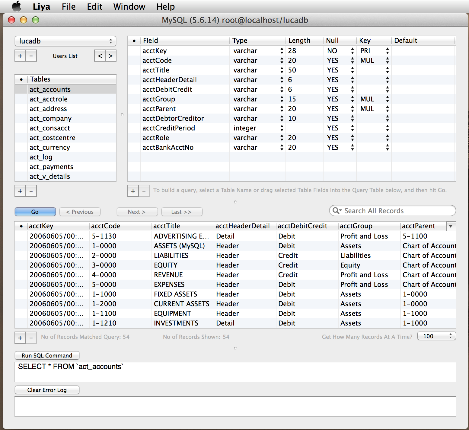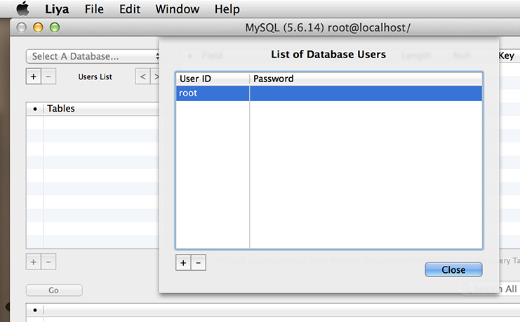 2.0 Aug 6th 2011. Liya version 2.0 for Lion released. 2.0.1 Aug 19th 2011. Added the Minimum System Key to denote that the app will only work on Lion. 2.0.2 Aug 24th 2011. Improved support for SQLite databases. Liya now knows how to handle SQLite tables which were created with data types specified in UPPER-CASE, as well as SQLIte databases which include stat tables. Liya can now open such databases properly. 2.0.3 Nov 7th 2011. Minor bug fixes. 2.0.4 Feb 19th 2012. Fixed a problem whereby a new PostgreSQL database user, created from Liya, does not have the correct privileges granted to it to create tables in the database. 2.0.5 Mar 8th 2012. Bug fixes. Includes updated database connectors to match the latest versions of MySQL, Postgres and SQLite3. Also, Liya will now do everything with a Postgres database that it can currently do with a MySQL database. For example, Liya can now do data entry and searches for data in fields with quotes, double-quotes, apostrophes, umlauts, diacriticals, any human language (like Traditional or Simplified Chinese or Tamil), and even partial date strings, for both MySQL and PostgreSQL databases, and it will do it consistently across Mac, iPhone or iPad devices. 2.0.6 July 1st 2012. Bug fixes for timestamp handling in PostgreSQL and SQLite3, and for Boolean handling in SQLite3. Plus numerous other bug fixes. Please keep your bug reports coming. The Search function has been changed to bring it more in line with the way Liya works on iOS devices, i.e., Liya now searches against the database, as opposed to searching against the records retrieved. This is meant to help Liya work faster across a slow Internet connection and the user can now specify a batch size for the number of records Liya should fetch each time. Finally, there is a revamped interface for sending arbitrary SQL commands to the database. And, one more thing, this is also the first version of Liya that will work on Mountain Lion, though we haven't implemented the Sandbox yet (that'll bring some restrictions and loss of features, believe me). 2.0.7 July 24th 2012. Bug fixes. Also fixed Liya so that SQLite databases (with .sqlite, .sqlite3 and .db file extensions) can simply be opened by double-clicking from the Finder, as has often been requested. 2.0.8 Aug 23rd 2012. Bug fixes for SQLite date field handling. Added ability to open connections to MySQL and PostgreSQL databases on non-standard ports. This version tested also to work with MariaDB databases. Will work on Mountain Lion. 2.0.9 Sep 2nd 2012. Added the ability for Liya to connect to MySQL, MariaDB and PostgreSQL databases via specified named sockets. Our SQL database installers for MySQL, MariaDB and PostgreSQL now come with Preference Panes that allow you to start the database from custom ports. 2.0.10 Sep 2nd 2012. Tabular data from Liya can be dragged and dropped onto a spreadsheet like Numbers but the number of columns brought over was always one short because of a stupid bug. This has been fixed in version 2.0.10. 2.0.11 Dec 1st 2012. Fixed Liya so it'll handle SQLite fields declared as Bool. Liya will treat it as an integer, and map it to the Cocoa NSNumber data type. Also, while it was always possible to drag and drop Liya table contents data onto a spreadsheet like Numbers, this version makes it easier by turning on also copy and paste. Liya will now also show the version number of the MySQL, MariaDB or PostgreSQL database that it is connecting to in the title of the connection window. 2.0.12 Dec 1st 2012. Fixed Liya so it'll handle SQLite fields declared as Real. Also added .sql and .sqldb to the document file types (a set which includes sqlite, sqlite3 and db) that will automatically launch Liya. 2.0.13 Oct 23rd 2013. Fixed Liya so it'll handle SQLite fields declared as very long 64-bit integers. Some bug fixes for date and number formatting. This version has also been tested on Mavericks. From this point on, Liya will be a 64-bit binary, dropping support for 32-bit machines and OS X Lion. 3.0 March 8th 2014. Support for the App Sandbox in the (currently awaiting review) App Store version, plus support for SQLite dates created by Core Data, plus some bug fixes and minor interface improvements. 3.0.1 March 18th 2014. The Mac Sandbox requires the Open Panel to be used for navigating to SQLite files, and so the URL and Database Name fields, in Liya 3.0, were locked from editing to force the user to use the Open Panel. However, if the user has Command-copied a path to a SQLite file (onto the pasteboard), Liya 3.0.1 now allows the user to Control-Click on the URL field to get a contextual menu that allows the URL to be pasted into the URL field, which then helpfully opens the Open Panel, thus restoring the copy-and-paste functionality, while still meeting the requirements of the Sandbox. Also, for the non-App Store version - restored the ability to check for updates to Liya from the Help menu.