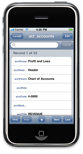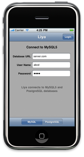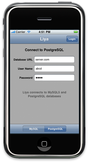 Liya connects to MySQL and PostgreSQL databases, and allows iPhone users to access and edit the database contents. It's a free download. The latest version is 1.1.3. It supports multi-lingual data entry & search and iOS4 multi-tasking. There is also a Liya for the iPad on the App Store. Need help setting up MySQL and PostgreSQL databases? Use Liya on the Mac. |