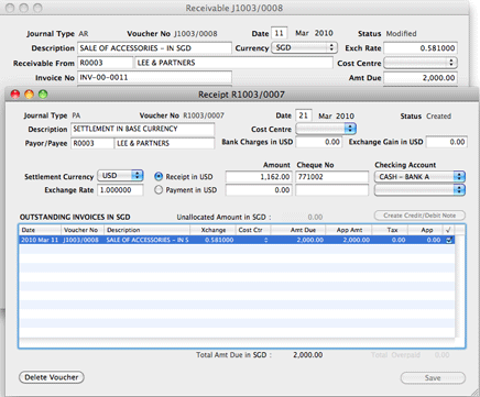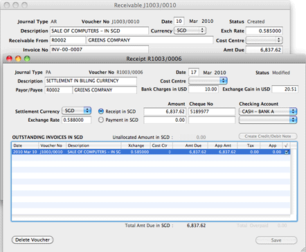 Invoice INV-00-0007 was issued in SGD (Singapore Dollar), with the exchange rate of 0.585000 at the time of issue. A cheque is received in the billing currency (i.e. SGD), for the full settlement of the invoice amount of SGD 6,837.62. A currency exchange gain of USD 20.51 is automatically computed by the system.