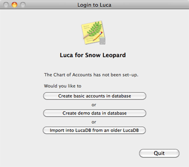 • "Create basic accounts in database" lets you create a minimum Chart of Accounts to start using Luca. You may modify the Chart of Accounts as needed.