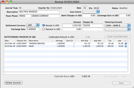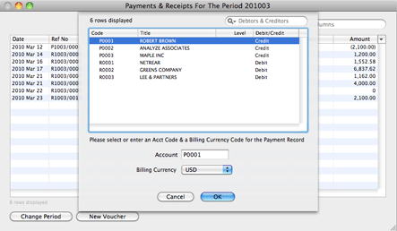 To retrieve the invoices, go to Journal > Payments & Receipts, and click the New Voucher button. Choose the debtor/creditor and the currency of the invoice.