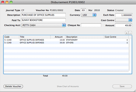 The following is an example of a Cash Disbursement entry. USD 49.00 has been paid, using petty cash, for the purchase of office supplies from Sunny Bookstore.