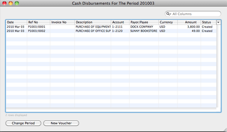To make cash disbursements to one-off vendors, or for expenses without an invoice, use Journal > Cash Disbursements. Examples of such cash disbursements are purchase of postage stamps, purchase of office supplies and transportation expenses.