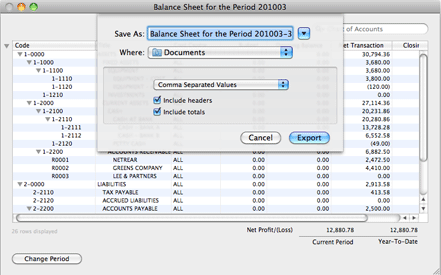 The export facility allows listings to be exported in either Comma Separated Values (CVS), or Tab Delimited format. The user has the option to export or leave out the column headers and totals, if any.