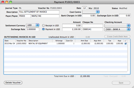 The following is an example of a full settlement of a payable invoice.