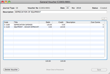 Transactions can be entered as double-entries in Journal > General Vouchers. An example of such a transaction is the record, Depreciation of Equipment, as shown here :
