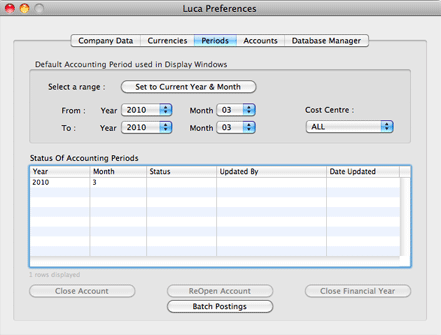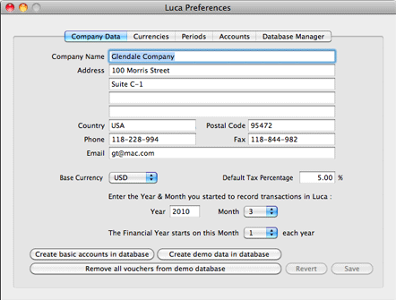 This Preference pane lets you set up the base currency code, default tax percentage, the period in which you start recording transactions in Luca and the start of your accounting month in your accounting year cycle.