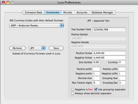 Currency display formats and decimal number precision can be set for individual currencies (e.g., the Japanese yen has no decimal places and you can set this, as shown below, by setting Max fraction digits to 0) :